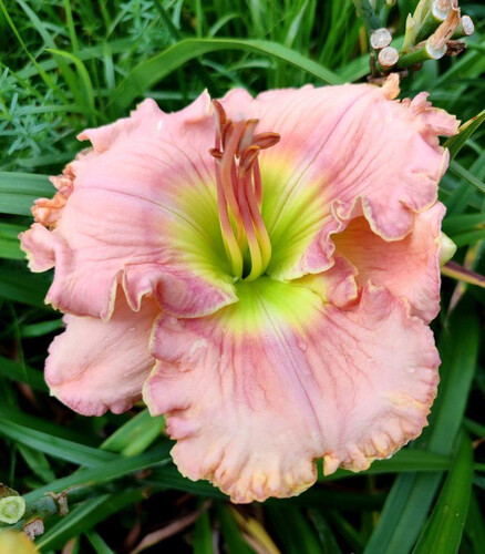 Оригинатор: F Smith 2007г. Размер цветка: 17см. Высота: 85см. Средний Мягкий пастельный цвет. Розовые глаз и кайма, чёткий жёлтый край, огромное восковое зелёное горло. Очень широкие лепестки. |