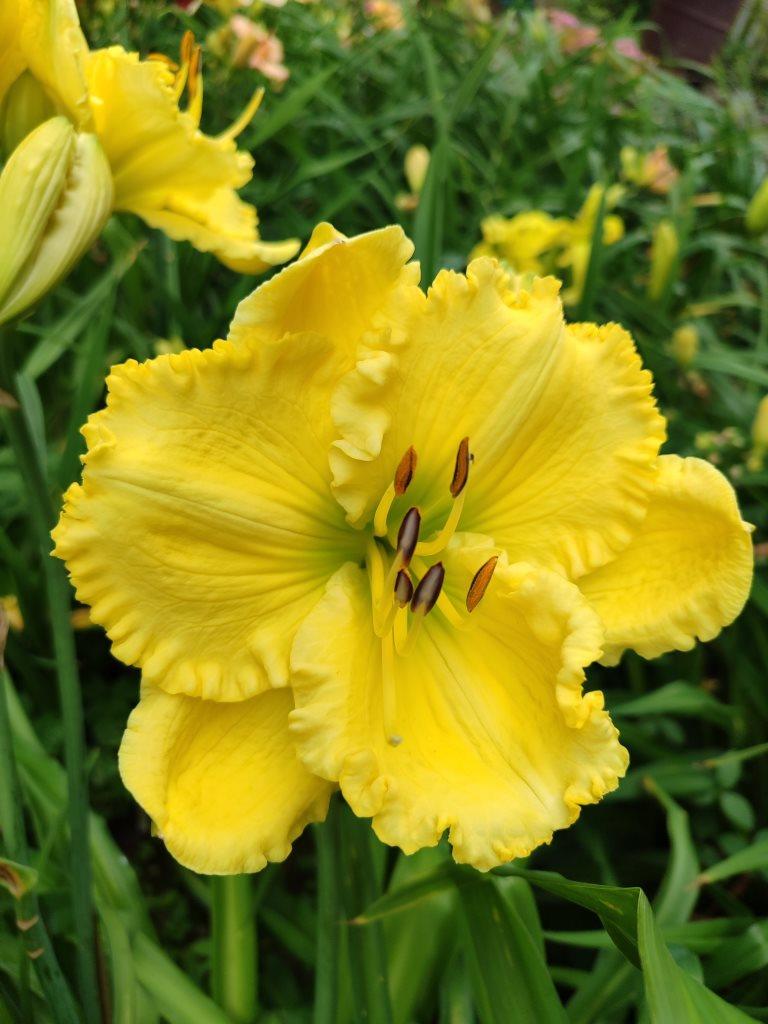 Оригинатор : F.Shooter 2009 Размер цветка: 17.5см. Высота: 92 см. Срок цветения:Средне -поздний (в Подмосковье успевает процвести) Огромный солнечно-жёлтый, зеленовато-жёлтое горло, гофрированный. Плотная ткань лепестков. Мощные цветоносы. В саду смотрится бесподобно. |