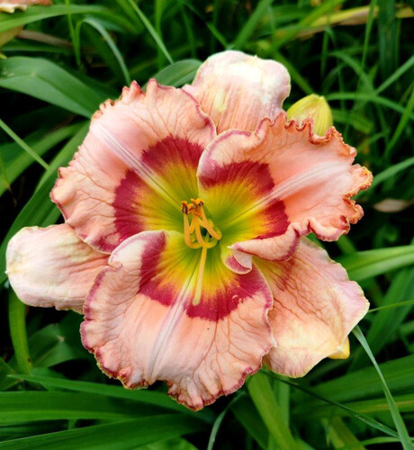 Розовый, глаз и кайма - вишнёвые, зелёное горло, душистый