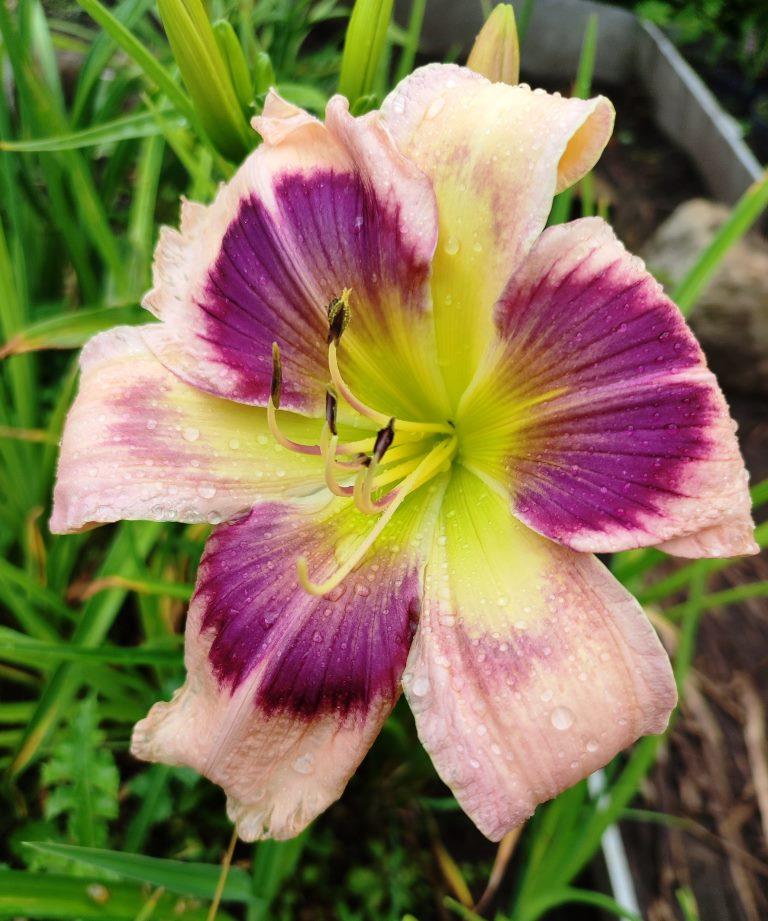 Оригинатор : Lamberston 2014 год. Диаметр: 18 см. Высота: 85 см. Ранне-средний UFO Сиреневый с большим слоистым серо-сине-фиолетовым глазом с фуксиевым контуром. Большое зелёное горло. |